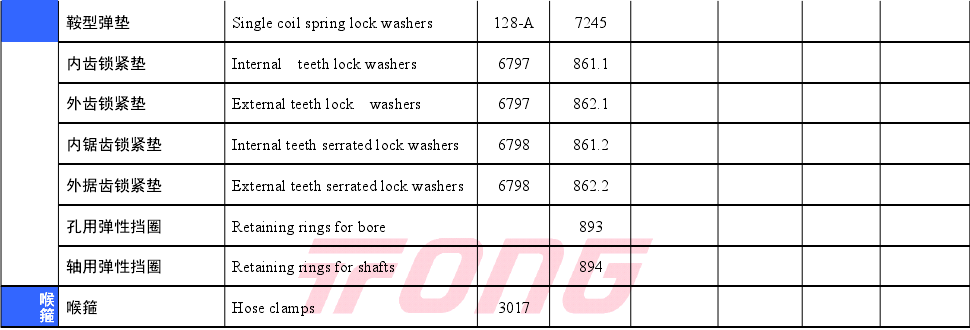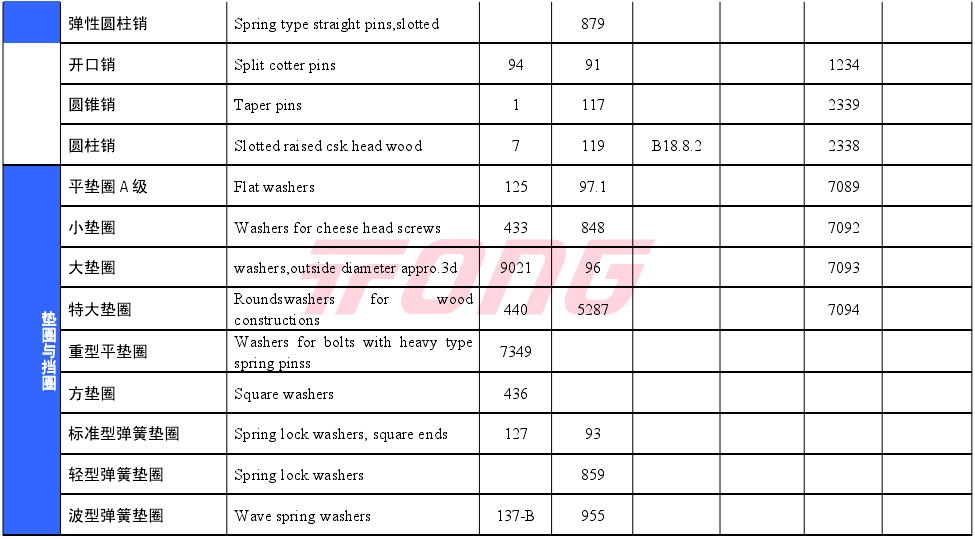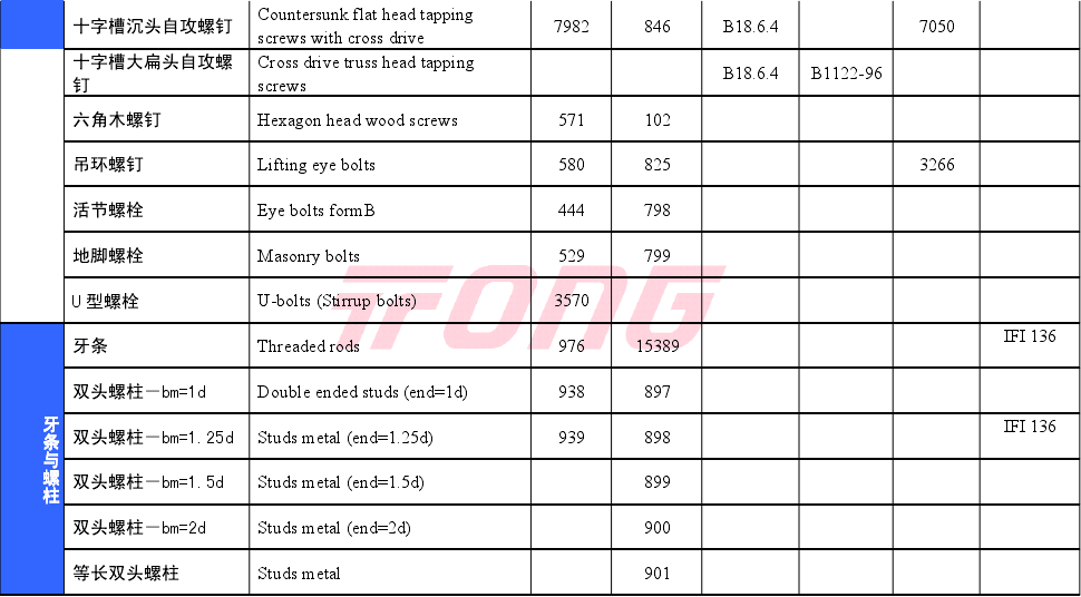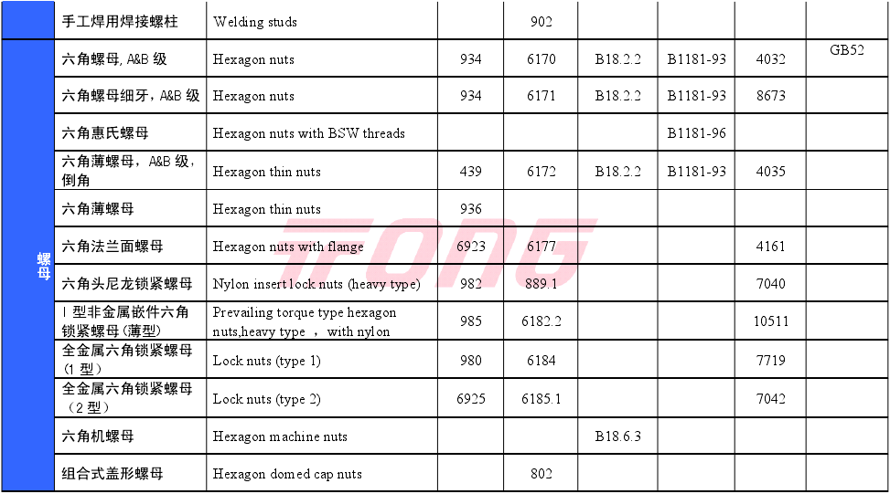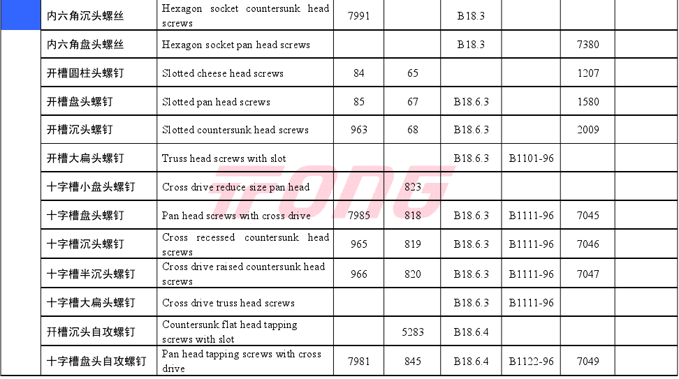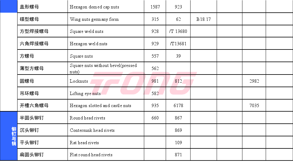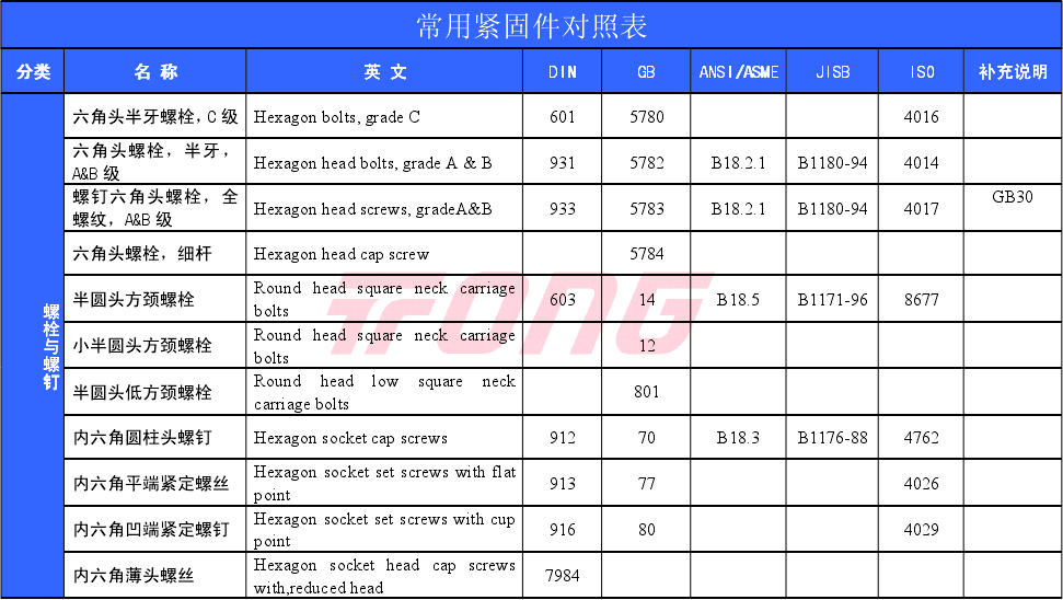 常用紧固件对照表